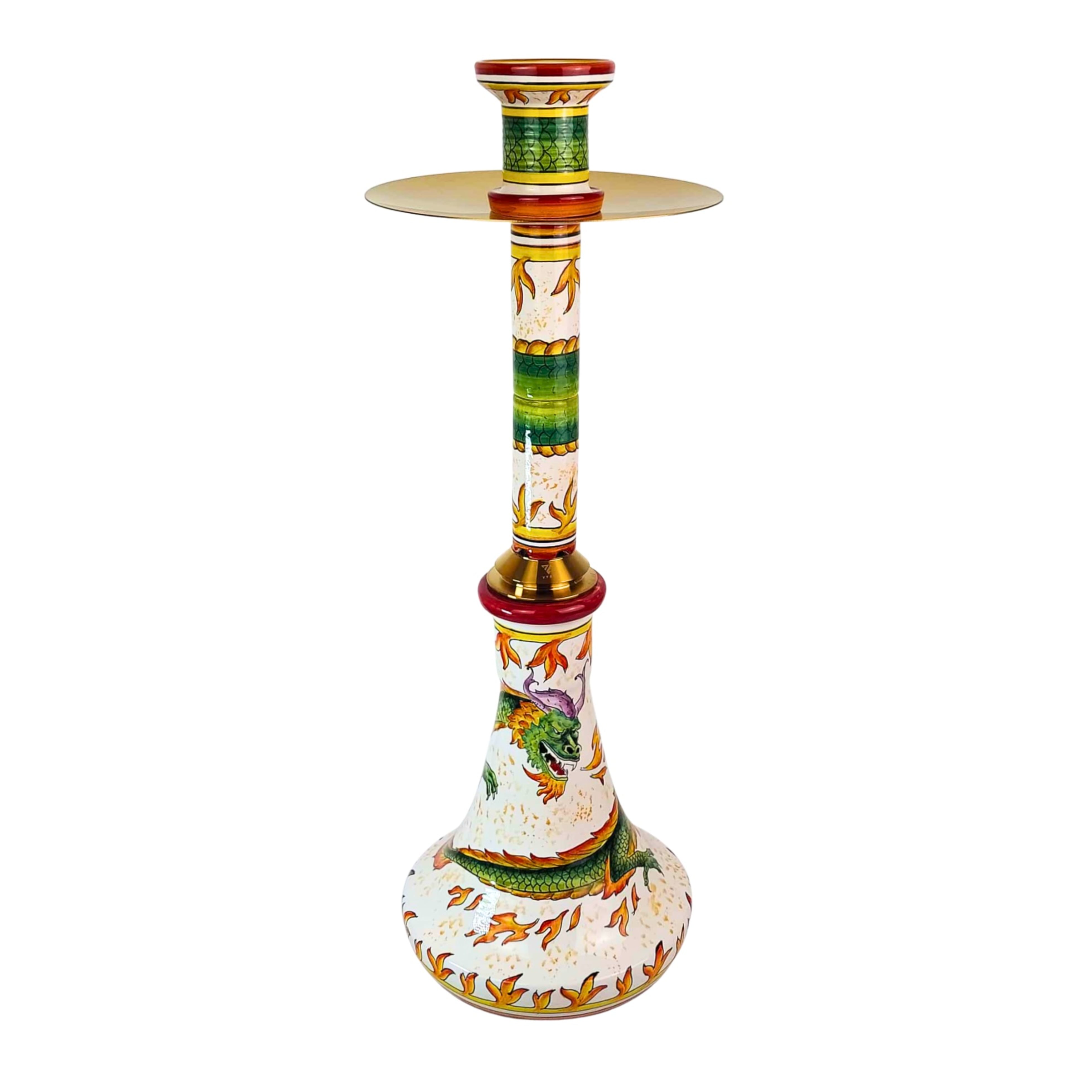 Fully hand-painted from base to top. A Chinese dragon wraps around the body, green scales, open jaw, flames everywhere. The kind of piece that makes people stop mid-conversation and ask "where did you get that."